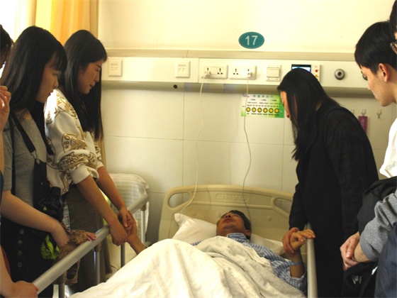 “好想赶快见到老师,我们要给老师加油鼓劲。”黄柏青老师在设计艺术学院带的研究生刘旭英听到消息后第一时间向学院提出了请求。在其从教生涯里,黄老师国内国外桃李满天下,在学生的眼里他亲切温和、学识渊博,正所谓“一日为师,终生为父”,很多学生也都发自内心地唤他一声“黄爸爸”。当学生得知他出事故,现已转回长沙湘雅二医院接受康复治疗的消息后纷纷表示要前去看望他,面对着这群可爱的学生们,出于安全考虑,4月18日中午,在设计艺术学院党委副书记陶双和三位辅导员的带领下,6位学生代表一齐前往湘雅二医院看望黄老师,这其中既有研究生,也有本科生。在近一个小时的车程后,一行人终于见到了躺在病床上的黄老师,视传1403班班长刘安康一把握住班主任黄老师的手,在路上准备了好久想对老师说的话,在路上不断提醒自己在见到老师后一定不能哭泣,可就在那个瞬间眼泪还是不争气地流了下来,千言万语只化成了淡淡一句“老师,学生来看您了。”