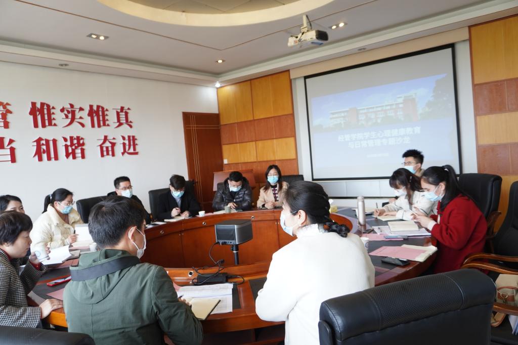 3月25日上午,经济与管理学院在云塘校区文科楼D区506(腾讯会议间同步)组织开展了学生心理健康教育与日常管理专题沙龙。学工部心理中心主任龚勋、副部长王煜坤、心理中心易敏老师到学院指导工作,院党委书记丁丹、副院长彭新宇、全体辅导员参加,沙龙由院党委副书记唐青主持。