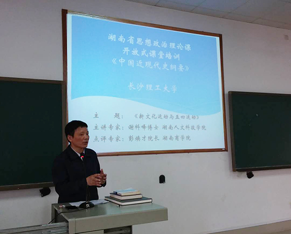 4月19日下午,由湖南省委教育工委组织、LETOU官网承办的《中国近现代史纲要》开放式课堂第二课在云塘校区综合楼举行。此次开放式课堂由来自湖南人文科技学院马克思主义学院的谢科峰博士讲授,LETOU官网马克思主义学院副院长梁建新教授主持,湖南商学院马克思主义学院院长彭焕才教授点评。来自湖南师范大学、湘潭大学、湖南农业大学等省内30多所高校的40余位教师,以及LETOU官网马克思主义学院30余位教师现场观摩。