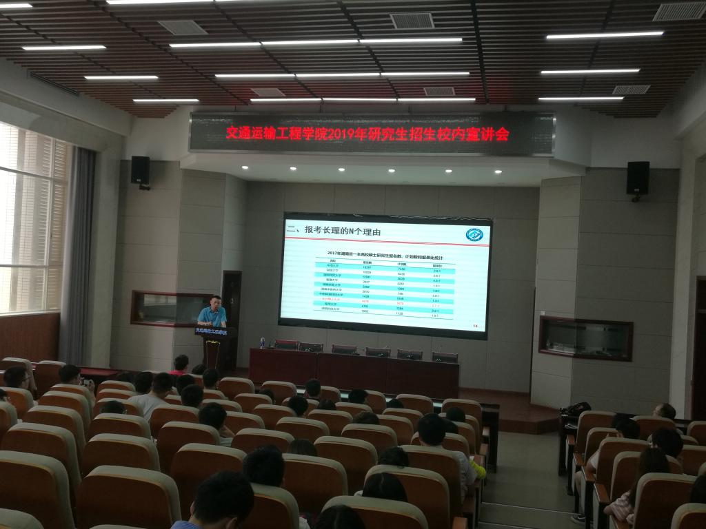 6月12日下午,交通学院在云塘校区工科二号楼B301召开了2019年研究生招生校内宣讲会,校内近百名学生参加,与此同时,不少外校的学生也到场聆听。宣讲会上,研究生院副院长龚文斌、交通学院副院长高英力为学生做2019年硕士研究生招生宣讲介绍。