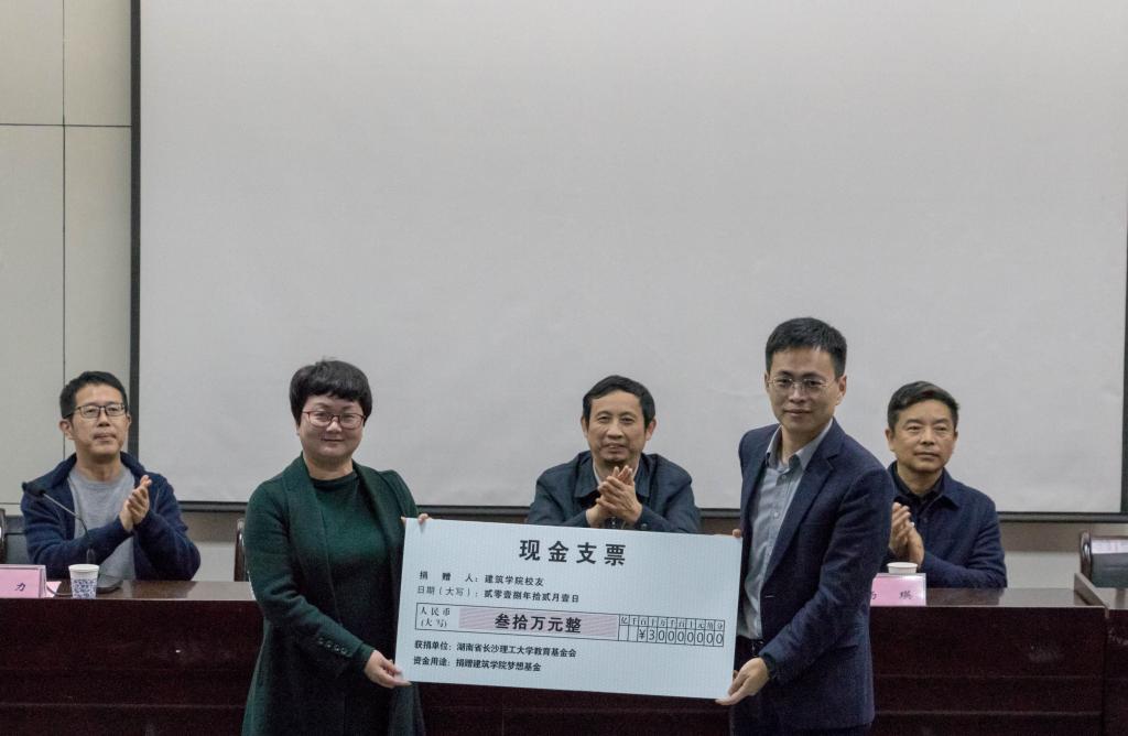 郑延恒代表学校教育基金会接受了第一批三十万“建筑学院梦想基金”的捐赠。