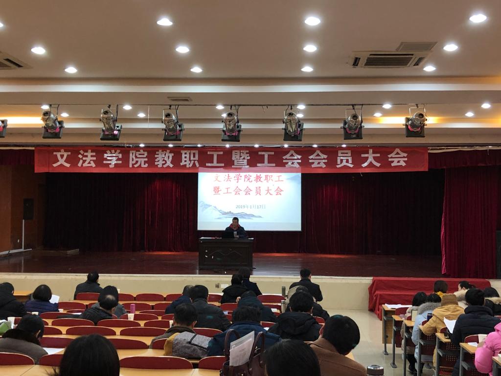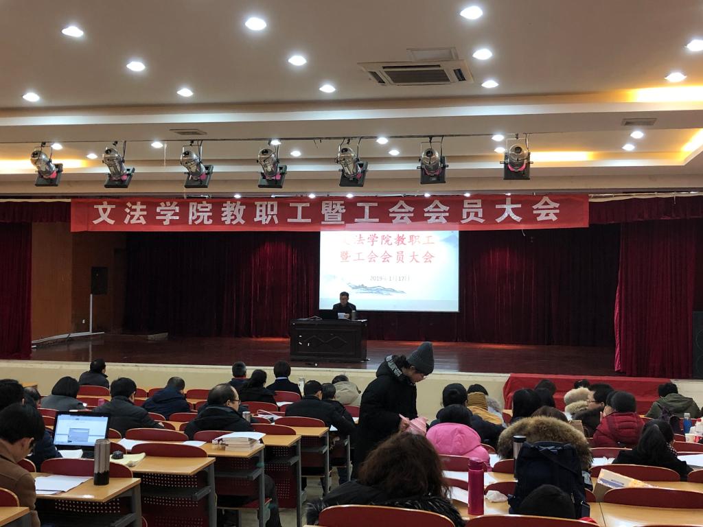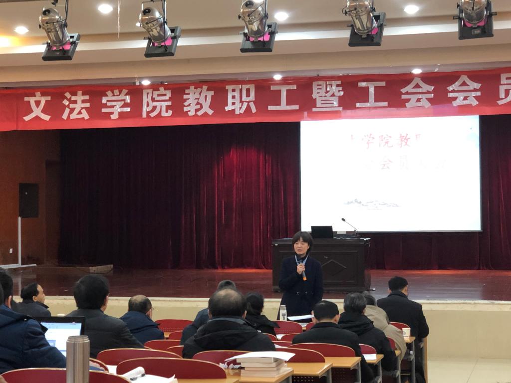 1月17日下午,文法学院四届四次教职工暨工会会员大会在文科楼模拟法庭举行。会议由学院党委书记孔伟红主持。