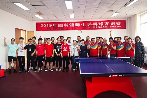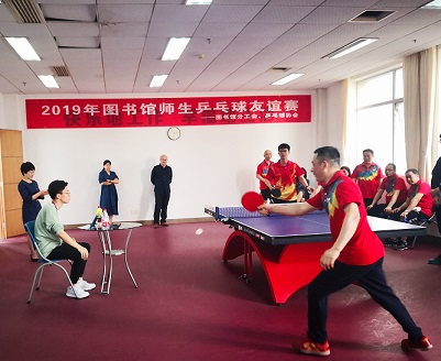 4月9日下午,由图书馆联合校团委组织的“2019图书馆师生乒乓球友谊赛”在云塘图书馆职工之家活动中心举行。本次比赛由图书馆乒乓球队和校学生乒乓球协会训练队共计16名运动员以及副馆长张颖参加,图书馆党总支书记曾令球、副馆长兼分工会主席施频等馆领导到现场观摩。