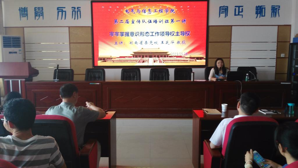 5月28日下午,学院第二届宣传队伍培训班在工一B503正式开班。学院党委副书记丁丹主持开班仪式,中共湖南省委党校教授王芝华主讲第一课,学院党委理论学习中心组成员、各党支部宣传委员、学生辅导员以及学院网站、微平台采编人员、各学生班级微支部负责人参加。