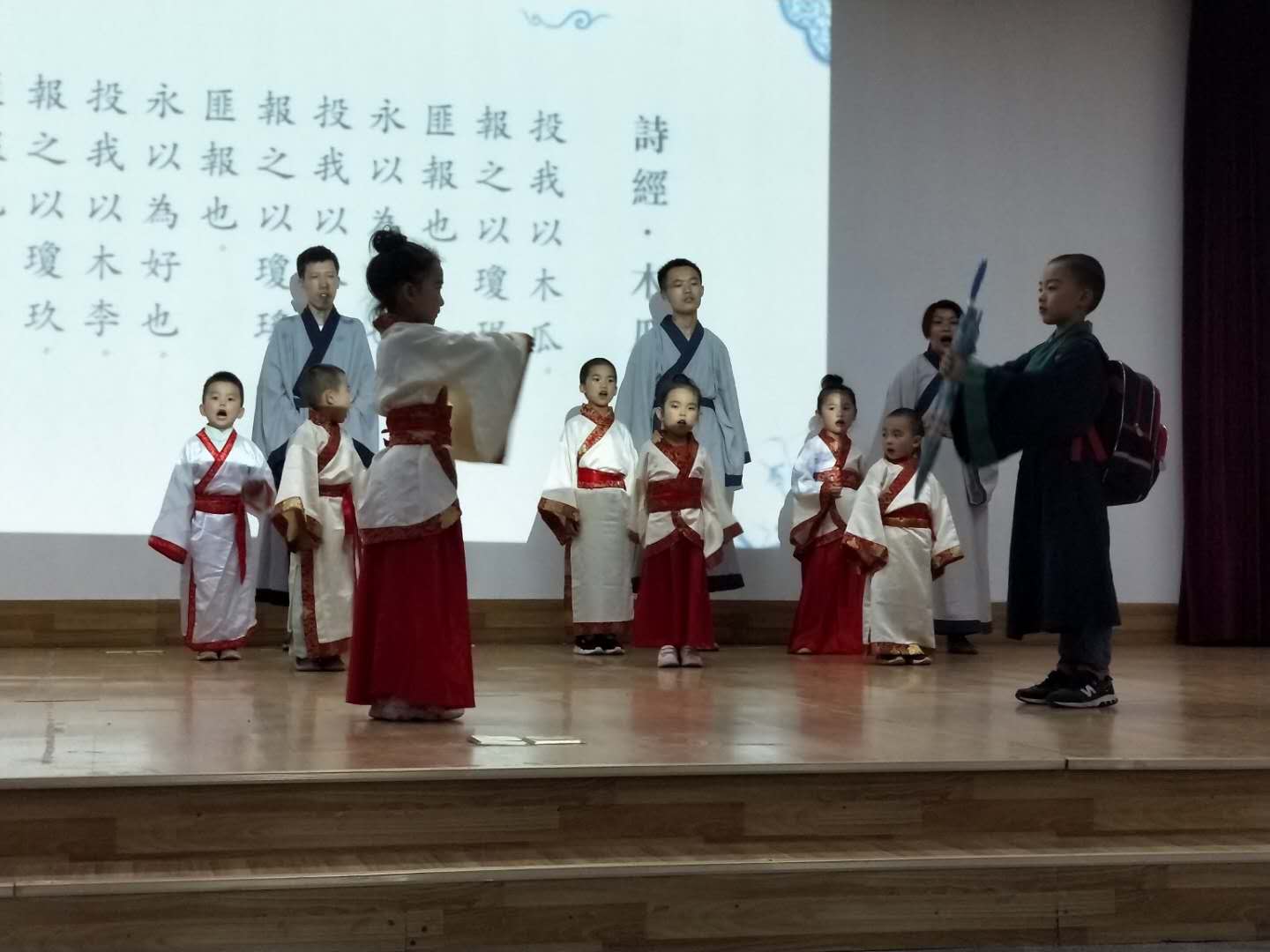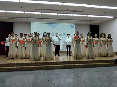 整场晚会以吟诵经典为主,与色空鼓演奏、舞蹈、瑜伽、传统武术相结合,加上电影配音、合唱等多种形式体现端午节的纪念意义。一群小书童用一种特别的方式演绎了诗经《木瓜》,小书童以上京赶考前辞母、交代家中妹妹要照顾好母亲、路上迷路、缺少吃喝遇到好心农夫照应的表现故事情节,其反复吟唱的“投我以木瓜,报之以琼琚”引起大家强烈的共鸣。小书童们诗词联诵《古朗月行、游子吟、一东》、《端午即事》、《传统武术》等节目,稚嫩的身形,清脆的童声,憨态可掬的模样引起台下阵阵笑声。蒋步云的色空鼓《云水禅心》流水潺潺,清云如絮,有风徐来,清荷引蜓。空灵的鼓声,让人忘记了尘世的喧嚣,全场静了,心,静了。文法学院的晏雯、盛胜龙表演的《醉花阴》,其吟诵体现唐诗的音韵之美,张彤吟唱了范仲淹的《苏幕遮》,让人惊奇于吟的古诗词,原来可以这样美!《离骚》、《湘夫人》、《屈原》电影配音让大家穿越时空,看到了三闾大夫的家国情怀。城南学院《我和我的祖国》气势恢弘,把晚会推向了高潮,随着在场师生不断融入这歌声里,一张张笑脸定格成美妙的一瞬间,整场晚会落下帷幕。