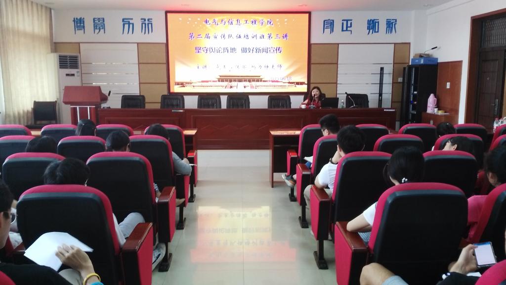 6月18日下午,电气学院第二届新闻宣传队伍培训班第三讲在工一B503举行。本讲特邀学校党委宣传部杨力铮老师授课,培训班全体学员参加。