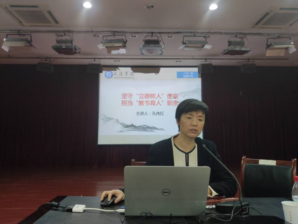 孔伟红从新时代高等教育的目标与要求、落实“立德树人”根本任务是全体教师的时代使命,坚守我们的“初心”担当“教书育人”使命职责三个方面讲解党课主要内容。结合学院教师案例,她指出学院工作中的问题与挑战主要表现为:忘记教师的基本职责:工作中对利益得失斤斤计较,监考、指导都要求绩效、报酬;对教书育人要求目标不高:只教书不育人,课程思政不思考;不能保持学习进取状态,缺乏自我提升;对如何教好书没有追求,满足于完成教学任务;言传身教不到位:不注意言行、乱放炮;不能协调好自己的工作与生活,情绪带进课堂、转移给学生;个人价值追求偏差,不能给学生以正能量的支持与指导。