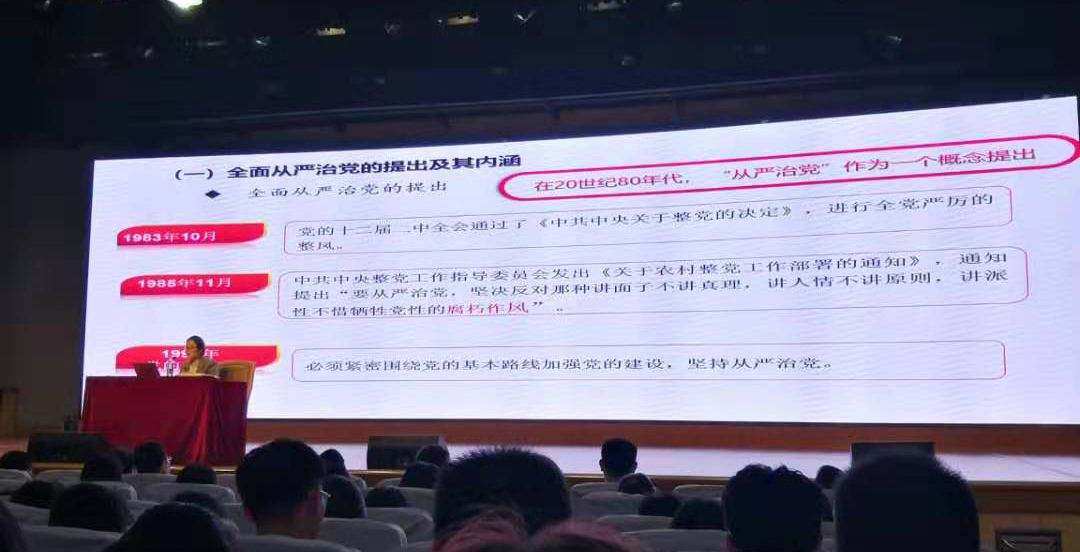 陈立中以《推动全面从严治党向纵深发展》为题,首先阐述了新时代全面从严治党的意义及成效。她指出,在20世纪80年代,从严治党作为一个概念提出,也是经历了一个过程的,其核心是加强党的领导,基础在全面,关键在严,要害在治。全面从严治党改变了管党治党宽松软状况;增强了“四个意识”;全党理想信念更加坚定,党性更加坚强;贯彻新时期好干部标准,选人用人状况和风气明显好转;党的建设制度改革深入推进;把纪律挺在前面,这也是新时代的一个重要特点;出台中央八项规定,严厉整治“四风”;巡视利剑作用彰显;坚持反腐败无禁区、全覆盖、零容忍。全面从严治党永远在路上。