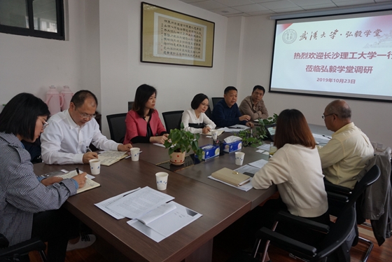 在武汉大学弘毅学堂,弘毅学堂院长石兢、综合管理办公室主任董甲庆、学工办主任程晓婷分享了弘毅学堂的历史发展、课程体系及内涵、创新创业、国际交流、书院教育特色等情况。双方就拔尖人才培养、跨学科大类培养、跨学院协同育人等方面展开了深入交流。