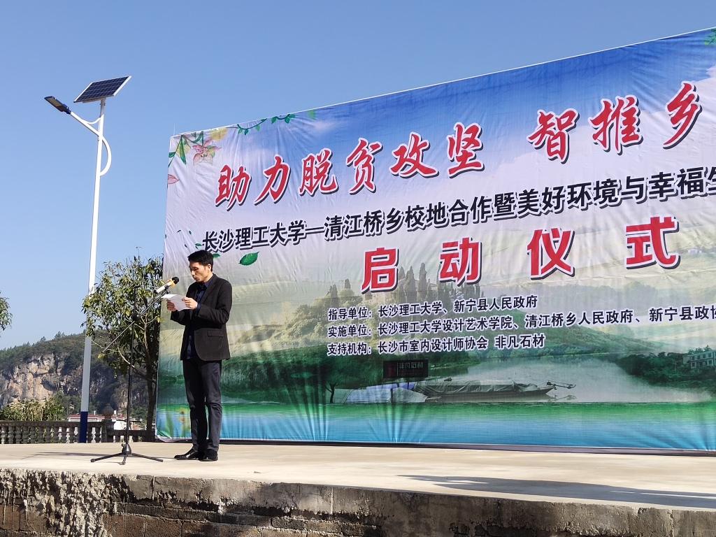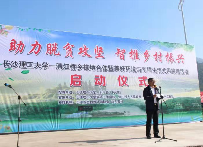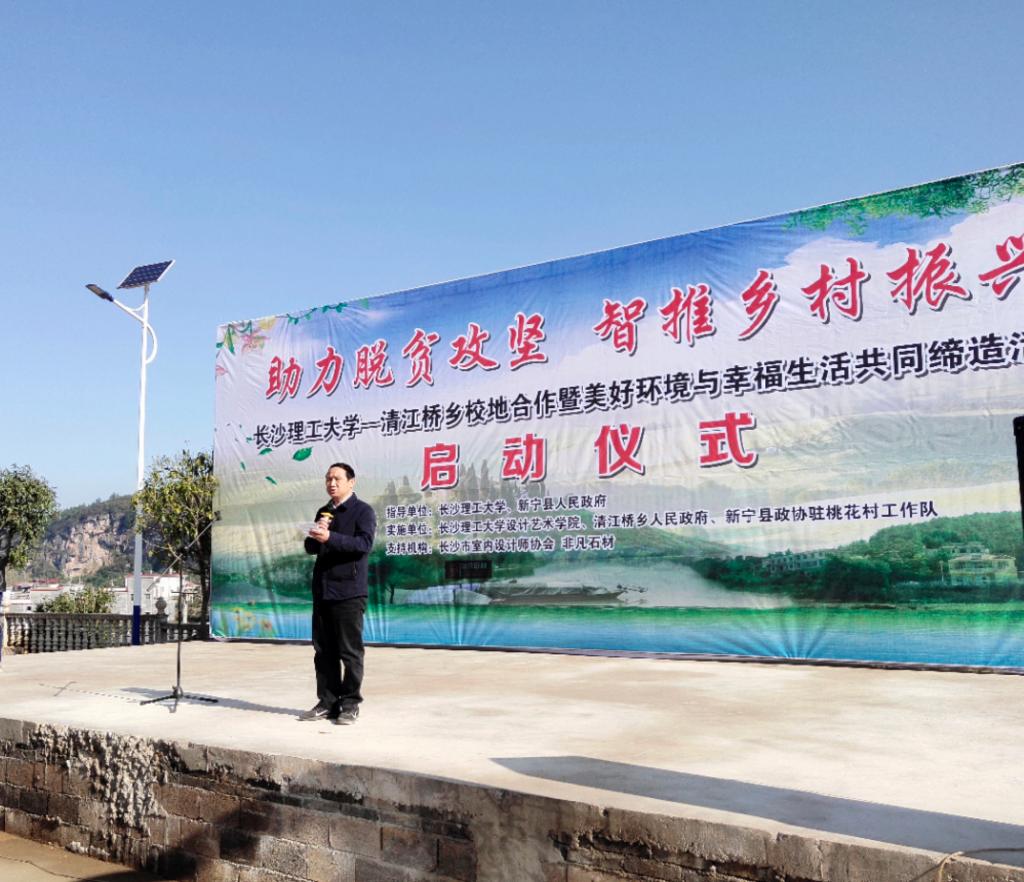11月14日,以“助力脱贫攻坚,智推乡村振兴”为主题的“LETOU体育平台——清江桥乡校地合作暨美好环境与幸福生活共同缔造活动”在清江桥乡赤木村综合服务平台启动。县政协主席蒋新雄,县委常委、人武部政委潘功宏、LETOU官网艺术学院肖志高等专家教授9人,180余名学生及长沙市室内设计师协会参加启动仪式。