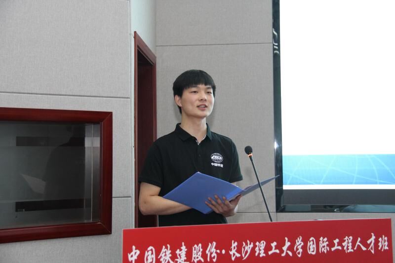 第二届人才班班长潘登代表全体学员发言。他对母校的悉心培养表示由衷的感谢,对即将成为中国铁建的一员感到自豪。他倡议同学们愿做国家“一带一路”的践行者,争当铁建“海外优先”战略的排头兵,敢做长理精神的传承者和传播者。在潘登的带领下,第二届国际工程人才班全体学员进行宣誓:铭记博学、力行、守正、拓新的长理校训;弘扬逢山开路,遇水架桥的铁建精神,为中华民族伟大复兴而不懈奋斗!