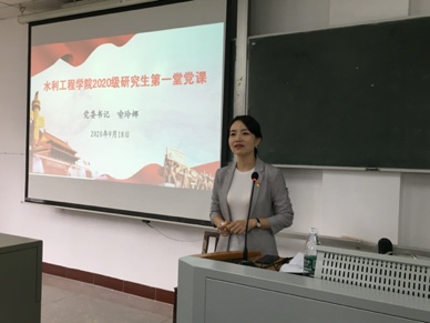 水利工程学院党委书记喻玲娜的“第一堂党课”以“最美的青春”为主题,她从“付出决定未来”“眼界决定境界”“自律决定人生”和“‘赢’的解剖”四个方面展开讲述,结合新冠肺炎疫情防控的生动案例,强调新时代是一个英雄辈出的时代,青年人正逢其时,勉励研究生党员不负青春、不负韶华、不负时代。她寄语2020级新生,用读书积蓄力量,用行动肩负责任,用拼搏昭示理想;牢固树立自律意识,不断拼搏,创造自己“最美的青春”。
