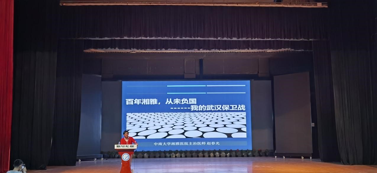 赵春光以“百年湘雅,从未负国”为主题,给大家讲述从武汉疫情爆发志愿逆行,到在武汉协和医院西院区重症区争分夺秒抢救病人,最终凯旋的战疫情况和心路历程。他说这就是和平年代的战场,而他有幸成为战士。逆行武汉,共赴国难,不仅是个人的英勇无私,更是整个家庭的默默支持。面对凶猛的疫情,赵春光说怕是人之常情,但是他不畏牺牲。他给大家分享了他在武汉抗疫时亲身经历的几个片段。