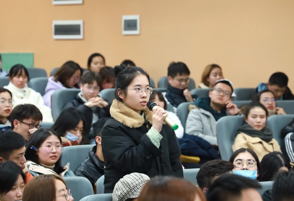 在“互动问答”环节,现场观众踊跃提问,警官们耐心解答同学们的问题,并讲述他们在出警中遇到的有趣故事。有同学问到,当他们在面对工作中危险困难,是如何看待自己的职业选择时,警官们坚定地回答,“穿上这身警服就要承担起对国家、对人民的责任。”掷地有声的回答赢得了在场师生的掌声。