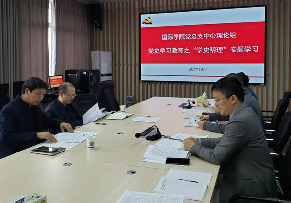 3月23日下午,国际学院党总支在学院会议室召开党史学习教育部署暨理论中心组“学史明理”专题学习会,会议由党总支书记刘安生主持,新任院长吴迪龙参加会议并一同学习。