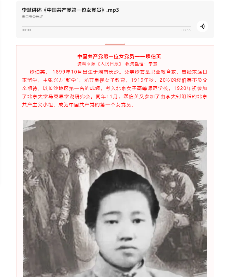 城南学院王志鹏老师生动讲述了周恩来总理《挤车体验》的故事,让听众深深感动于总理从细节入手,严谨、认真的工作作风。校工会副主席彭霞讲述《李先念下连队检查工作自称是通讯员》的故事,清亮干净的嗓音让人禁不住凝神静听。朗诵协会李慧会长深情讲述了《中国共产党第一位女党员——缪伯英》的故事,“我既以身许党,应为党的事业奋斗,直至牺牲。奈何因病行将逝世,未能战死沙场,真是恨事!”让听众不禁落泪。还有文学与新闻传播学院周雷老师讲述的《金色的鱼钩》、外国语学院刘音老师讲述的《陈云对家人实行“三不准”》、研究生院张茂华老师讲述的《手举马灯照万人》……每一个音频故事都承载着历史的厚重,蕴藏着珍贵的“红色记忆”。视死如归的革命烈士、顽强奋斗的英雄人物、忘我奉献的先进模范,在老师们的倾情讲述下变得鲜活起来。