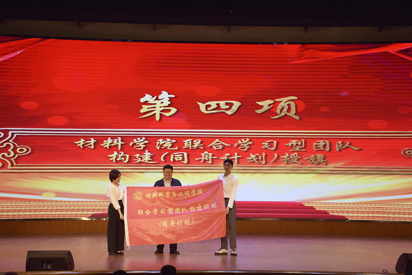 会上,研究生工作部副部长田上为材料学院研本学生联合学习型团队计划授旗,本项目是以优秀研究生为核心导师,在校本科生为指导对象,开展围绕学术科研、生涯规划、文体特长、公益践行、双创竞赛五个方面活动的联合学习计划。2020级程梓凯、孔令政同学表演的数来宝《优良学风传材院》、无机1702班合唱《少年》将表彰大会推向了高潮。