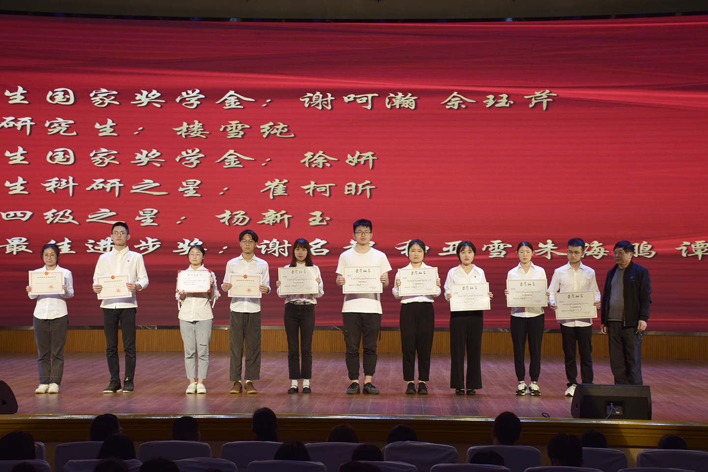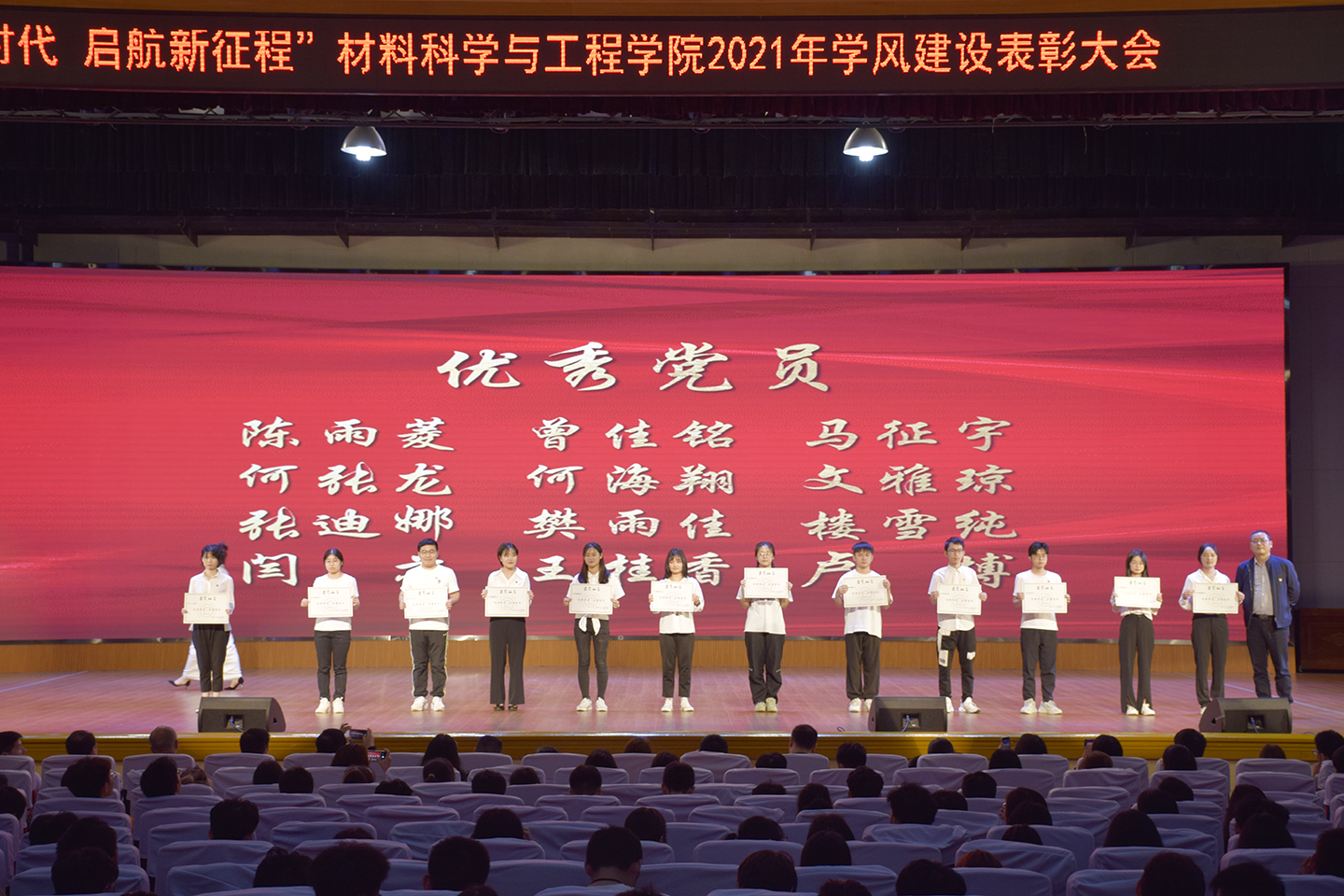 大会共分为信仰的力量、榜样的魅力、奋斗的青春三个篇章。材料学院党总支书记张国强、副书记陈华、优秀教师代表夏清宣读表彰决定。会上表彰了优秀班主任、优秀学业导师共计12名教师;表彰了优秀共产党员、优秀下班党员、研究生国家奖学金、卓越研究生、本科生国家奖学金、本科生科研之星、英语四级之星、学业最佳进步奖、优秀创新创业团队、优良学风寝室、校友奖助学金(材料之星、华泰单项能力奖学金、硅九十班创新创业奖学金、新材好料助学金),共计52名学生个人、17个学生集体。
