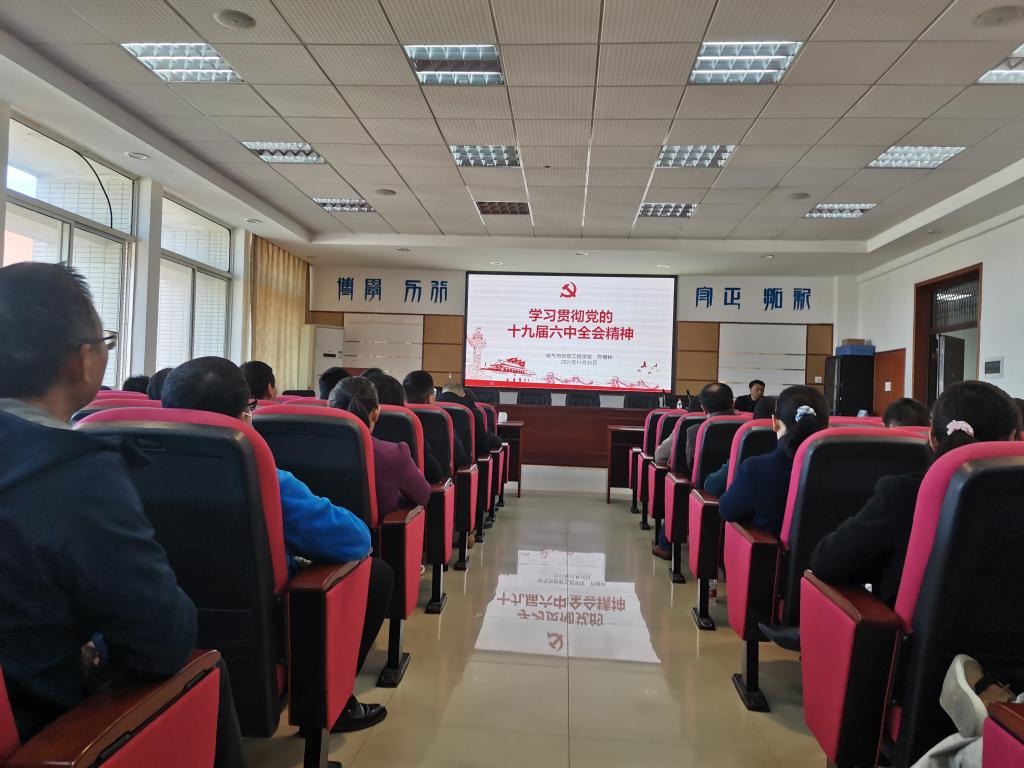11月30日下午,电气与信息工程学院党委书记符慧林在云塘校区工一B503为全院教职工上专题党课,深入学习贯彻党的十九届六中全会精神。