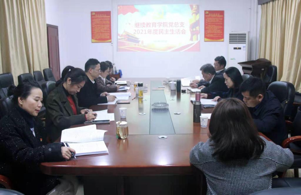 1月15日下午,继教学院党总支班子召开2021年度党史学习教育专题民主生活会。学校副校长谈传生和校督导组胡秀英到会指导,院总支书记何纯芳主持,总支班子成员参加。
