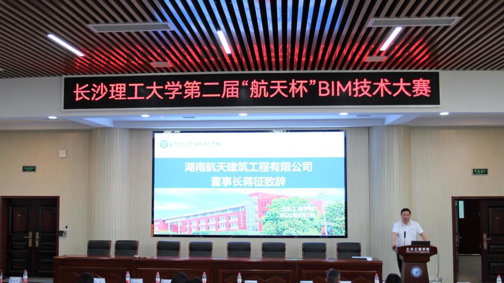 6月2日下午,由校教务处、校团委主办,土木工程学院承办的第二届“航天杯”BIM技术大赛决赛暨颁奖仪式在工二B302举行。湖南航天建筑工程有限公司董事长、党委书记蒋征,党委委员、副总经理左志坚,总经理助理张月月,工会主席徐晖,副总工程师方照、易剑辉,校教务处副处长李平,校团委副书记陈璐莎,土木学院党委书记江河,副书记黄阿明,副院长付果以及湖南航建相关负责人与学校相关指导教师参加本次活动。本次比赛由院团委学生会轮值主席王海川主持。