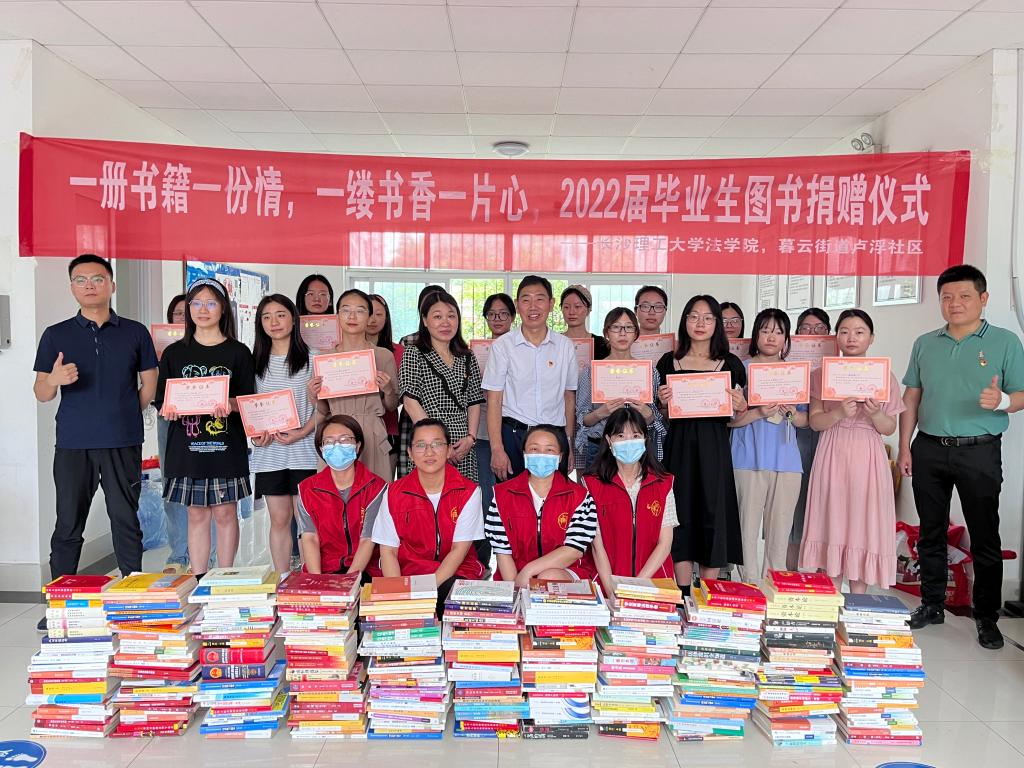 毕业季,同学们都在思考带走什么、留下什么,法学院毕业生党员们从宿舍书架上一排排书籍上找到了答案。6月9日,云塘校区敏行轩宿舍楼下一排整齐的书籍形成一面书墙,这是法学院与暮云街道卢浮社区2022届毕业生图书捐赠仪式的现场。