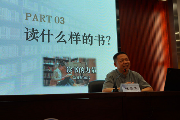 立身以立学为先,立学以读书为本。杜荣华以“站着上北大”的甘相伟、方舱里的“读书哥”等故事为引,围绕“为什么要读书”、“读书有什么力量”、“读什么样的书”、“怎么样读书”四个方面展开。他在讲座中旁征博引、引经据典,推荐了《论语》《习近平的七年知青岁月》等经典书籍,讲述了一些实用的阅读技巧和建议,并勉励长理学子把握人生读书的黄金时节,沉淀深刻思想,修养高尚品格,发扬为民为国的奉献精神。