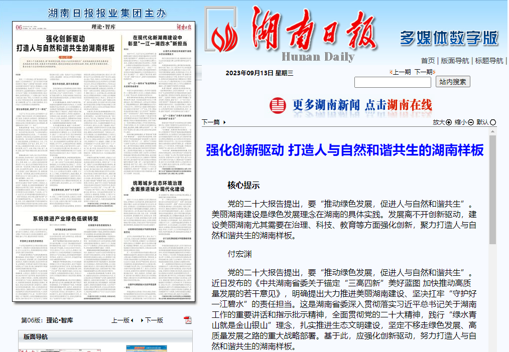 湖南日报:付宏渊:强化创新驱动 打造人与自然和谐共生的湖南样板 | 【2023-09-13】 | ||