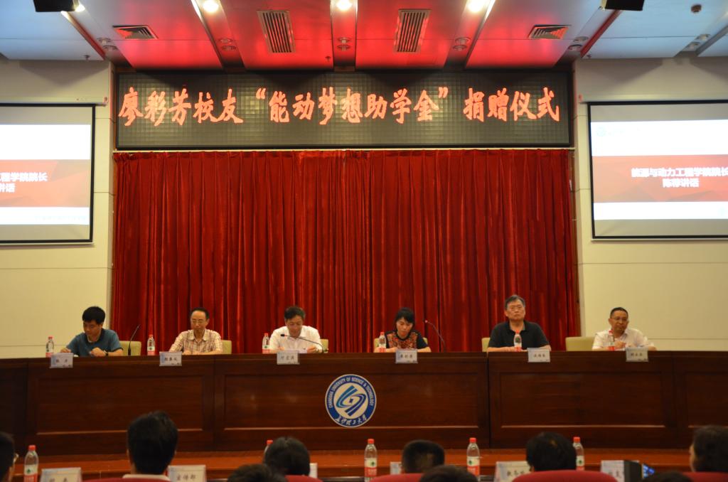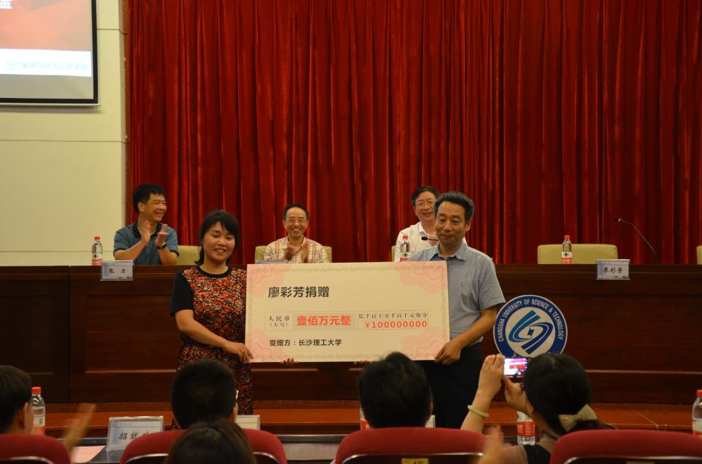7月6日下午,能动学院1985届电厂热能动力专业廖彩芳校友向学校教育基金会捐赠100万,设立“能动梦想助学金”,捐赠仪式于云塘校区图书馆报告厅举行。校党委书记付宏渊,1985届电厂热能动力专业校友、湘潭市人大常委会副主任颜集成,1985届电厂热能动力专业校友、中国能源建设集团湖南省电力设计院有限公司总经理张力,副校长谈传生,纪委书记胡永乐出席捐赠签约仪式。仪式由能动学院党委副书记兼副院长杨雪峰主持。