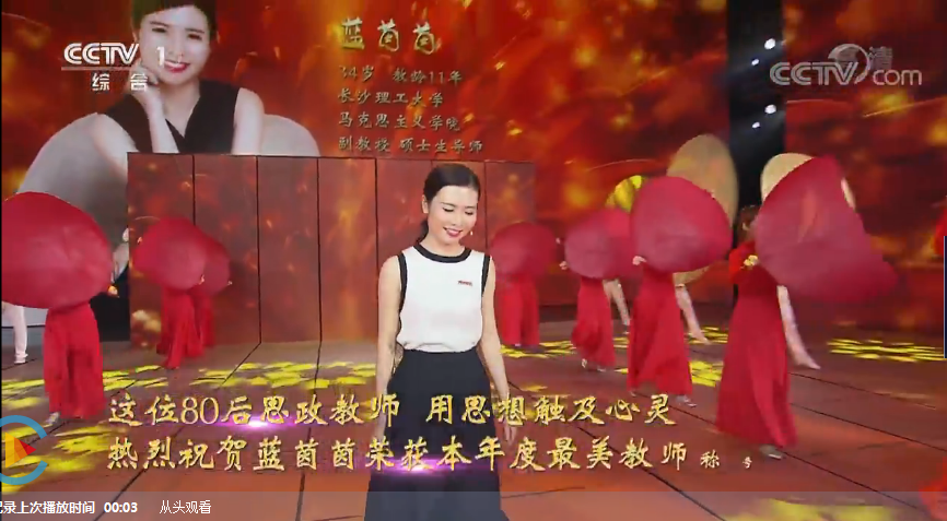 9月10日晚8点,中央广播电视总台综合频道(CCTV-1)播出教师节特别节目《2018年度“寻找最美教师”大型公益活动颁奖典礼》,LETOU官网马克思主义学院思政课教师蓝茵茵被评选为10名全国最美教师之一。