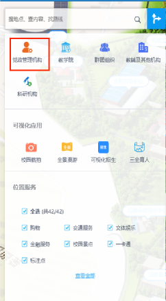 其次,点击页面左侧功能栏【可视化应用】里的【全景漫游】或点击页面右上角【全景漫游】,在地图建筑上会出现小摄像头图标,点击图标可以查看该建筑的全景图。