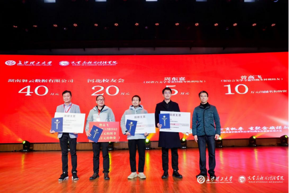 文新学院发展基金捐赠仪式和纪念文集发布仪式依次进行,陈仁凯上台接受捐赠,并为4位热心校友颁发捐赠证书。