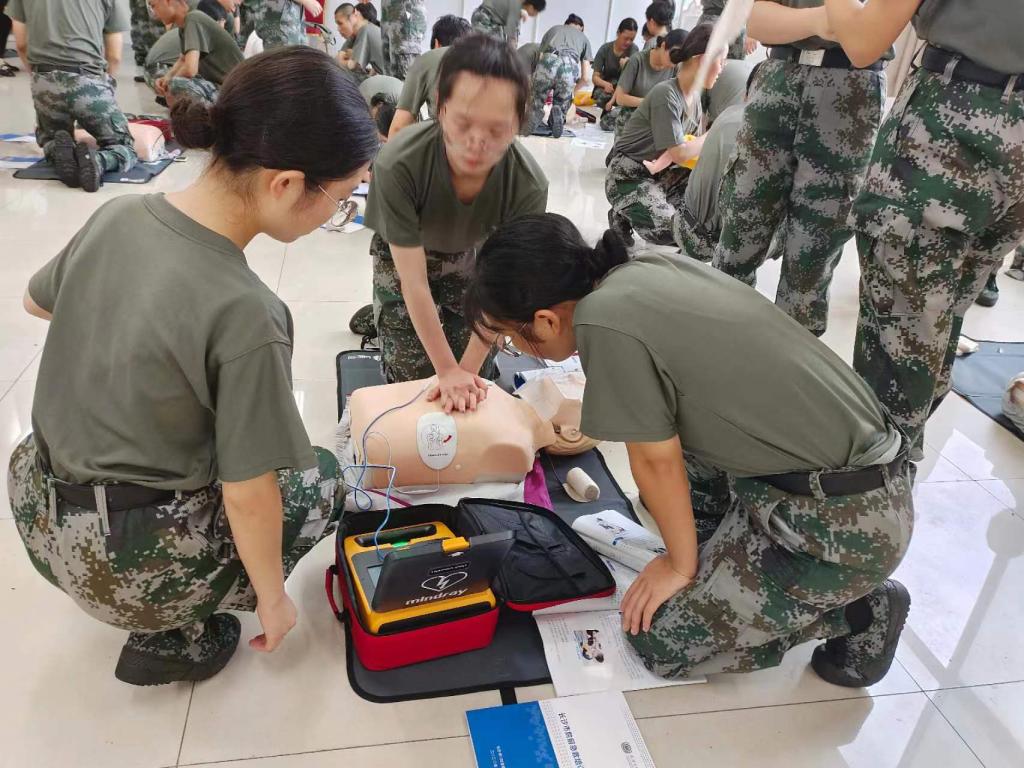 7月4到5号,校医院联合长沙市120急救中心开展了为期两天的2022年新生军训教官急救知识培训。培训内容包括心肺复苏术、常见急症处理、AED的使用、气道异物梗阻解救术、创伤现场急救技术。采取半天理论讲解,半天技能培训的方式。同学们利用模型进行心肺复苏术的练习,AED的使用,伤口包扎,互相练习海姆立克法。两人一组互相练习,老师现场手把手指导,最后进行了理论和操作技能的考试,人人过关并颁发了“第一目击者培训合格证”。