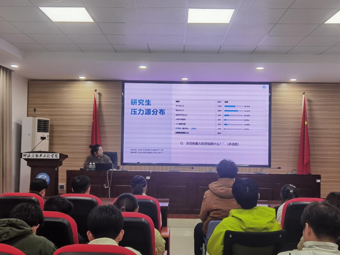 罗亦欧首先以“压力、情绪与自我”为主题,分别从研究生心理健康状况、压力与心理健康、情绪管理三个方面进行详细讲解。通过学校2024年秋季研究生思想状况调研报告与研究生心理健康的相关论文中的数据,分析了当前社会研究生的心理健康状况;然后通过引入案例,解读了压力是什么及苦难教育给我们带来的压力,分析了长期压力的影响及应对压力的步骤;接下来讲述了如何认识、觉察情绪,通过引入一些情景模拟,穿插讲述了研究生如何缓解自己的情绪、自查心理状态。最后,她为研究生提供了心理咨询的渠道,推荐了经典书籍和电影供同学们课后阅读和观影。