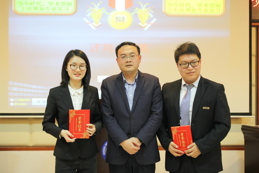 蒋维老师(中)与最佳辩手合影(左一尹佳慧,右一韩旭)