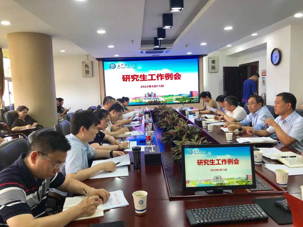研究生院院长杨华峰从研究生招生、培养、学位、思想政治教育等四个方面对学校2022年上半年学位与研究生教育工作进行总结,并对下阶段研究生教育工作提出了具体要求:一是要进一步优化和完善考试方案,提升工作水平,提高工作效率;二是要加强研究生管理组织建设,提升队伍建设水平;三是要结合本学科的特点,高标准、严要求推进培养方案的制定;四是要发挥指导教师的积极性与主动性,在科研创新、项目结题、学术研究等方面进行全方位指导。
