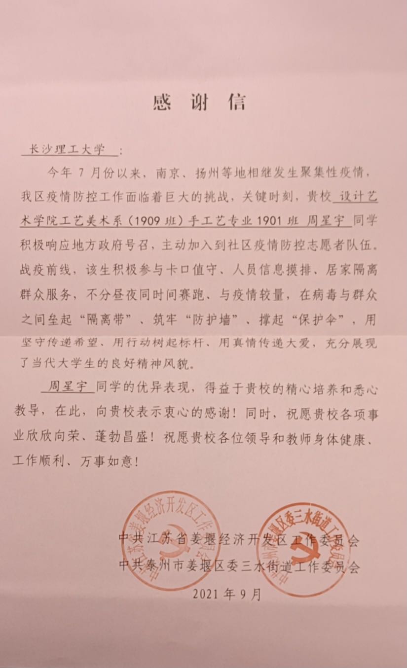 “今年7月份以来,南京、扬州等地相继发生聚集性疫情,我区疫情防控工作面临着巨大的挑战,关键时刻,贵校设计艺术学院工艺美术系(1909班)手工艺专业1901班周星宇同学积极响应地方政府号召,主动加入到社区疫情防控志愿者队伍。战疫前线,该生积极参与卡口值守、人员信息摸排、居家隔离群众服务,不分昼夜同时间赛跑、与疫情较量,在病毒与群中之间垒起‘隔离带’、筑牢‘防护墙’、撑起‘保护伞’,用坚守传递希望、用行动树起标杆、用真情传递大爱,充分展现了当代大学生的良好精神风貌。”9月7日,LETOU体育平台收到了这封由中共江苏省姜堰经济开发区工作委员会、中共泰州市姜堰区委三水街道工作委员会发来的感谢信。
