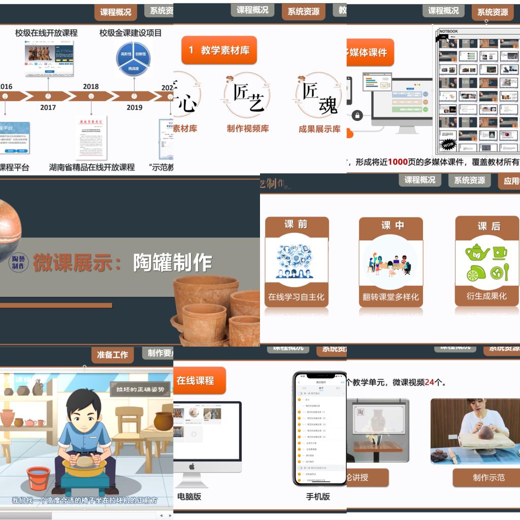 蒋瑛老师本次参赛的《陶艺制作》混合式教学系统及应用,包含了丰富翔实的教学资源,该课程主要基于学银在线,中国大学MOOC平台,采取混合式教学模式,以案例导向为主线,从课前、课中、课后三个维度为学生提供全方位的深度学习支持,充分体现了信息技术与课程教学深度融合。