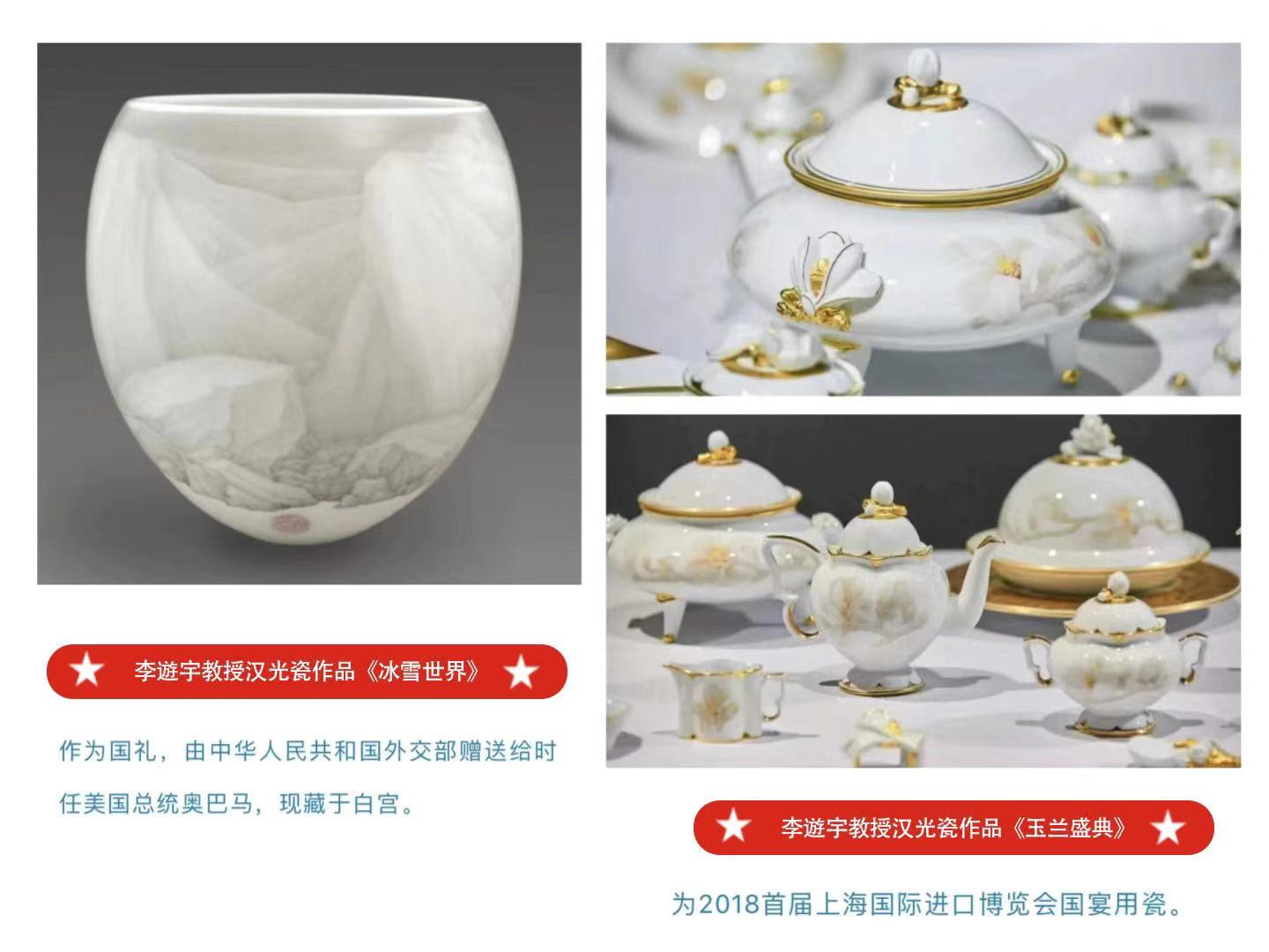李遊宇教授至今已获得国家多项发明专利,设计作品获国家级各类奖项二十多次,被国务院紫光阁、国家博物馆、国家珍宝馆、国家美术馆等国家级场馆典藏,并作为国礼赠送给美国、日本、希腊、韩国、沙特等国。李遊宇教授也因其成功研创汉光瓷及在瓷器领域的卓越贡献,被授予“中国陶瓷艺术大师”和“中国工艺美术大师”。