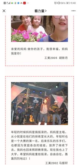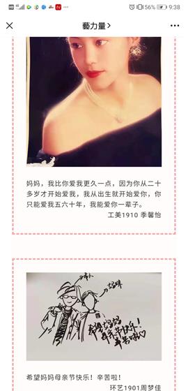 此次活动围绕“我和母亲的故事”、“我想祝福我的母亲”、“我的妈妈是‘神仙’”等话题面向设计艺术全院学生在学院官微“兿力量”的心理专栏“兿贴心”展开“妈妈,我想对你说”真情告白征集。本次活动收到了同学们的踊跃投稿,大家的对妈妈的真情告白,透露出浓浓的亲子温情,呈现形式也是各具特色,有节日文字祝福、与母亲的合拍视频、母亲年轻时的照片、故事,更有结合专业特色的手绘漫画形式。活动还为参与此次真情活动的近期返家同学发放母亲节鲜花,鼓励同学们与妈妈共度亲子美好时光,真诚感谢妈妈对于自己成长无私付出。