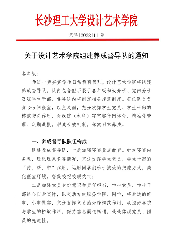 为进一步夯实学生日常养成教育管理,2022年3月,设计艺术学院组建了养成督导队,充分发挥设计艺术学院学生党员、学生干部的模范带头作用,对寝室实行网格化、精准化管理,定期通报,形成长效机制,落实日常养成。
