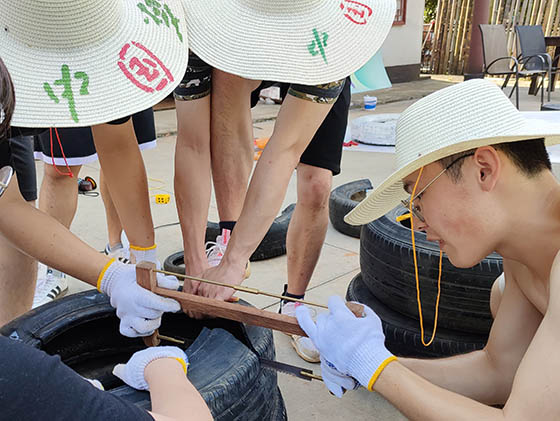 在带队老师文卫民的指导下,大家元气满满地开启新一天的工作。戴上装备,开始为清洗过的轮胎添上五颜六色的新衣,在阳光下透着新生的活力。另一队则抡起铁锹,光着膀子卖力地翻地,烈日之下他们挥汗如雨,却也阻挡不住大家迫切改造的热情!稍作休息后大家整装待发,继续进行工作。女生一队负责为轮胎上漆,男生一队则负责切割轮胎,做出造型。电钻、木锯、切割机齐上阵,火星四溅,电钻声口号声齐响,电光火石间轮胎便一劈两半。两队默契协作,不惧烈日,顺利完成今日工作!