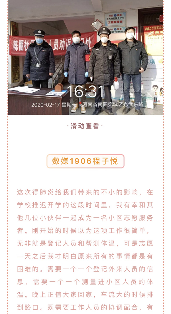 近日,习近平总书记给北京大学援颚医疗队全体“90”后党员回信,向他们和奋斗在疫情防控各条战线上的广大青年致以诚挚的问候。艺术学子对此感受颇深,愿将心中的情感通过纸笔抒发出来。在阅读中国青年参加抗疫的相关推送和文章后,纷纷拿起纸笔写下自己的感悟,每一份手写感悟,字里行间流露出艺术学子的真情实感。更是有许多学生成员自发进行抗击疫情的志愿活动,带起红袖章,化身抗疫前线的战士,守卫自己社区的那一份平安。每一篇感悟的字里行间,每一张照片都撼动着人们的心灵。