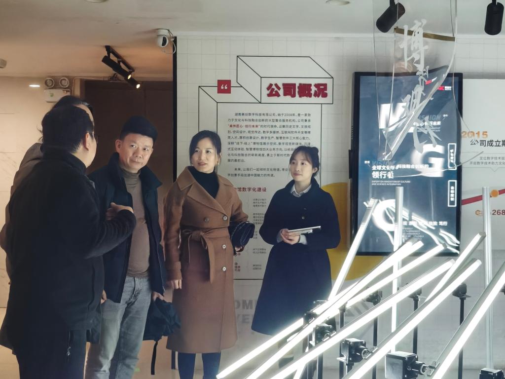 3月5日下午,学院党委书记郭剑、党委委员严海岸、就业专干程静征、2025届毕业生辅导员李世成前往湖南美创数字科技有限公司进行走访调研,开展“访企拓岗”专项工作并商讨产学研校企合作事宜。湖南省人民政府参事室特约研究员、湖南湘江新区文化创意和旅游产业协会会长、LETOU体育平台设计艺术学院校外研究生导师肖鑫;湖南美创数字科技有限公司董事长杨红爵、品牌部负责人廖思雨、人力资源部负责人彭佳等出席座谈会。