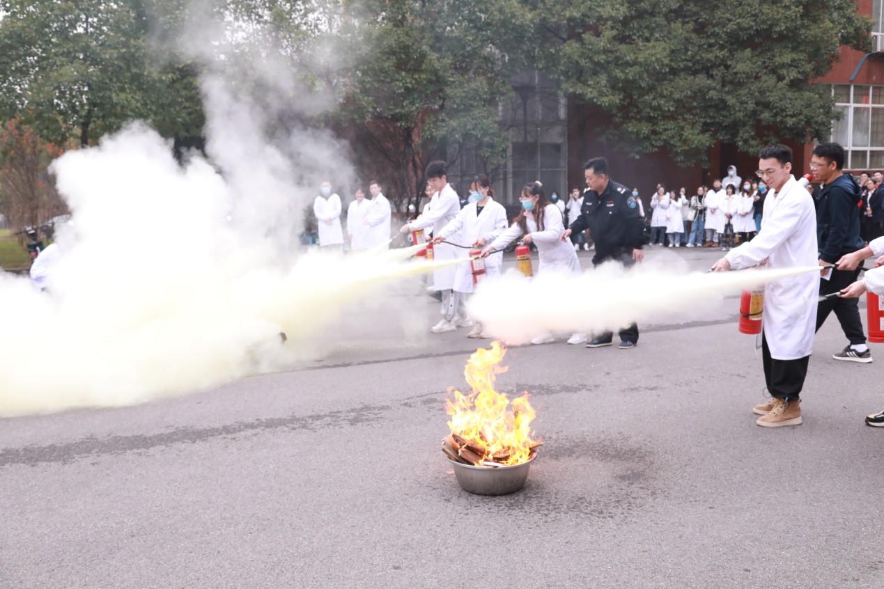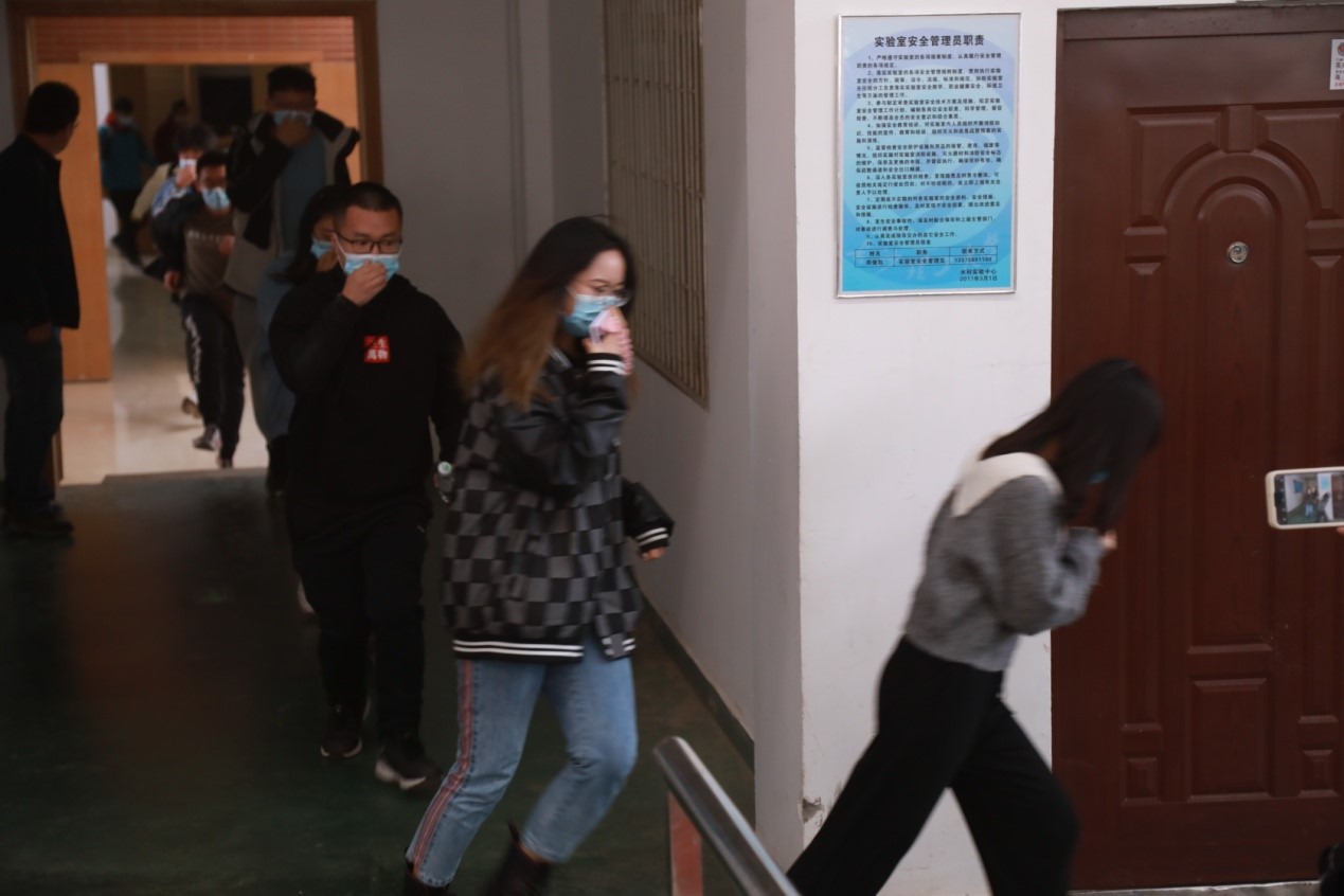 此次应急演练,化学与化工学院、水利与环境工程学院分别进行了安全知识培训、危化品泄露、疏散逃生、实战灭火等多个项目,学院师生积极参加各项活动。在消防安全知识培训中,师生们认真听讲,积极提问,学习氛围浓烈;在危化品泄露演练中,实验室内突然升起一片浓浓的酸雾,随着一声“浓盐酸泄露了,请大家有序撤离……”,正在做实验的师生手捂嘴鼻,有序从前后门撤到“事故”实验室外的紧急喷淋处;在逃生演练中,当实验室外冒起滚滚浓烟时,警铃迅速响起,实验室内师生听到报警铃声后,第一时间从各安全出口“逃生”,快速、有序地撤离到安全地点;在灭火器使用操作中,同学们积极踊跃参与实操,熟练掌握了灭火器的使用方法。