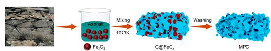 图1.废旧沥青衍生的介孔碳的制备流程图