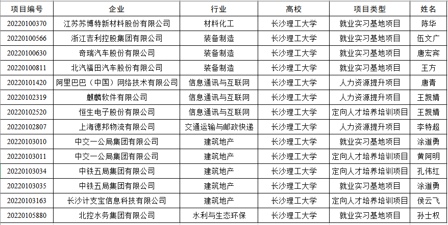 日前,教育部发布《教育部高校学生司关于公布第一期供需对接就业育人项目立项名单的通知》(教学司函[2022]7号),经过高校申请、用人单位申报、专家审核、立项单位信息核查等多个环节,长沙理工大学与中铁五局、中交一公局、吉利控股、阿里巴巴、北控水务等用人单位达成就业育人合作项目14个,其中就业实习基地项目7项,人力资源提升项目3项,定向人才培养培训项目4项,位居省属高校前列。