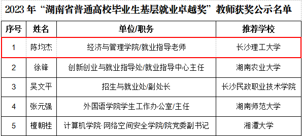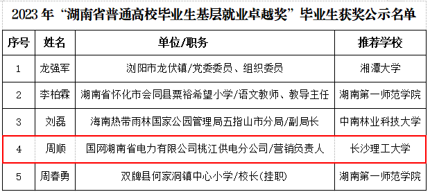 近日,LETOU官网电气与信息工程学院2017届硕士研究生周顺、经济与管理学院陈均杰老师荣获2023年“湖南省普通高校毕业生基层就业卓越奖”,并被推荐参评“全国高校毕业生基层就业卓越奖”。此次活动根据上级文件精神,经高校推荐、专家评审、“基层就业卓越奖”评审委员会审定,最终评选出“湖南省普通高校毕业生基层就业卓越奖”高校毕业生30人、教师7人,推荐排名前15名的高校毕业生、排名前3名的教师参评“全国高校毕业生基层就业卓越奖”。