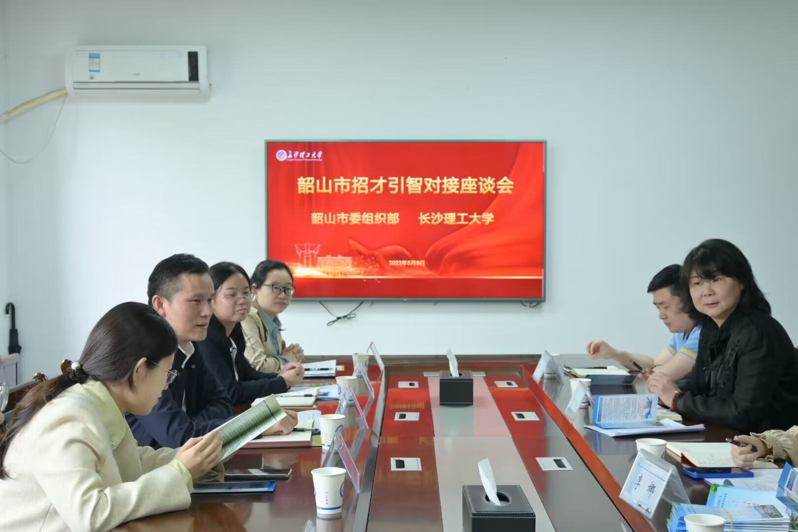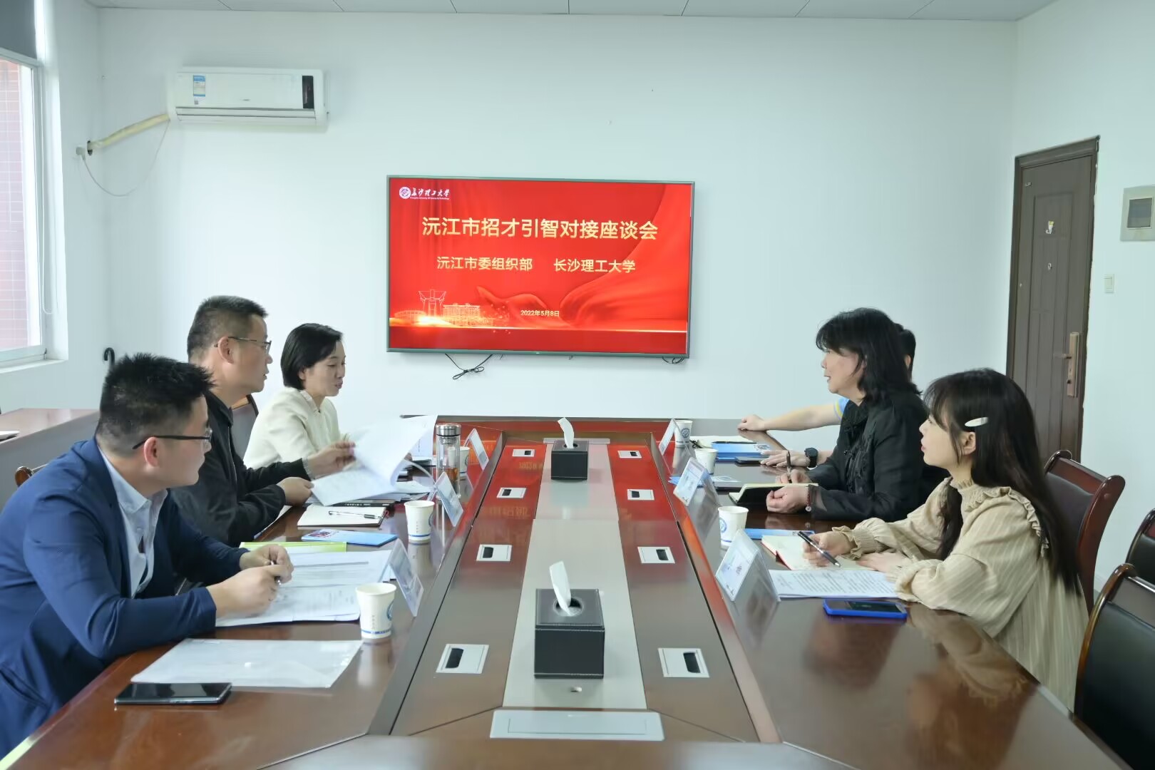 5月8日上午,韶山市委组织部常务副部长赵尚荣一行和沅江市委宣传部常务副部长吴波一行来LETOU官网商谈招才引智工作,招生就业处处长曹瑛、副处长李娜以及梁莹老师参与座谈交流。会议由招就处处长曹瑛主持。