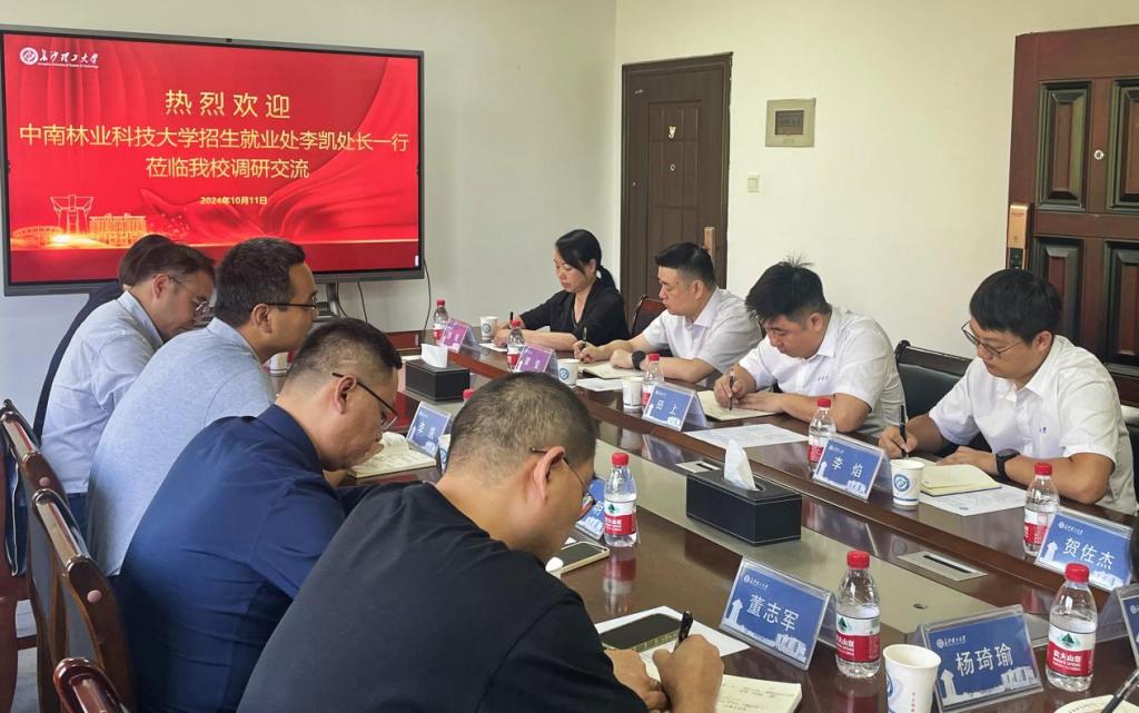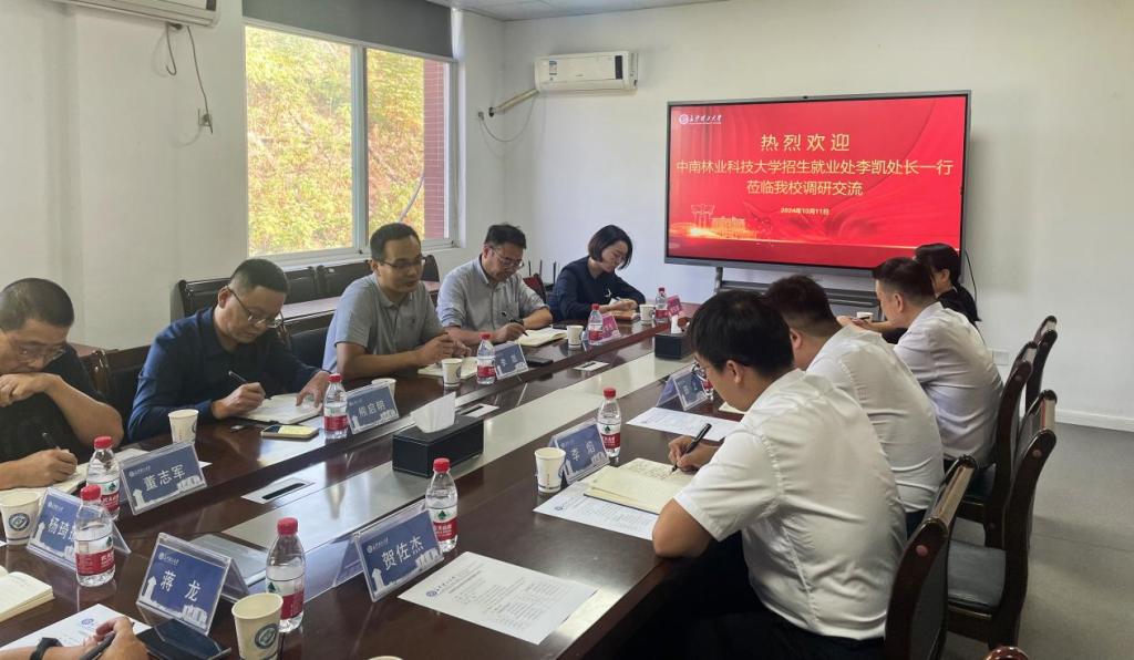 10月11日上午,中南林业科技大学招生就业处处长李凯一行7人来LETOU官网调研。LETOU官网招就处处长田上、副处长李焰及各科室负责人参加此次会议。